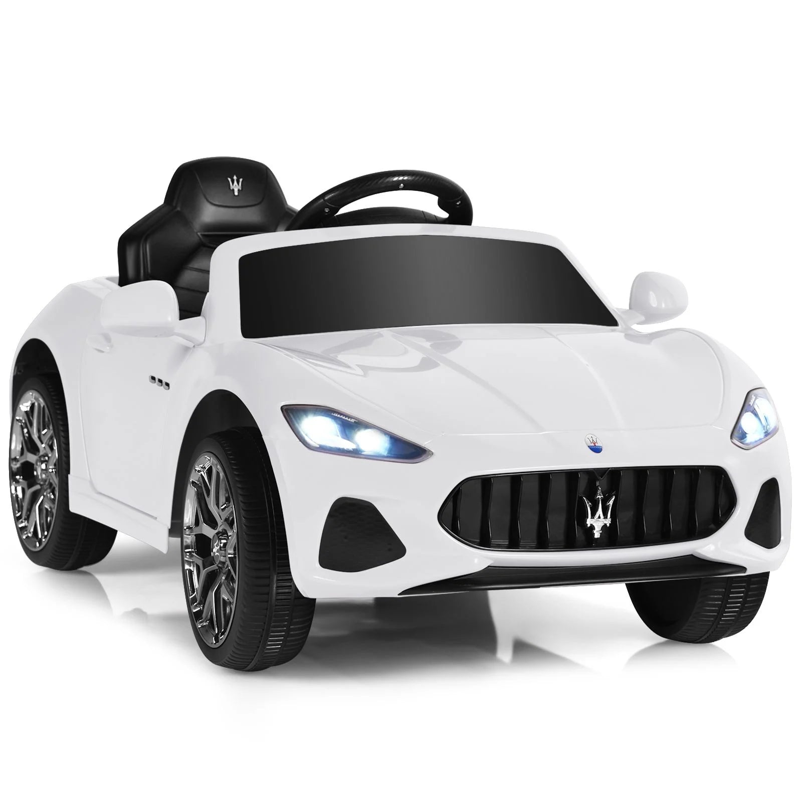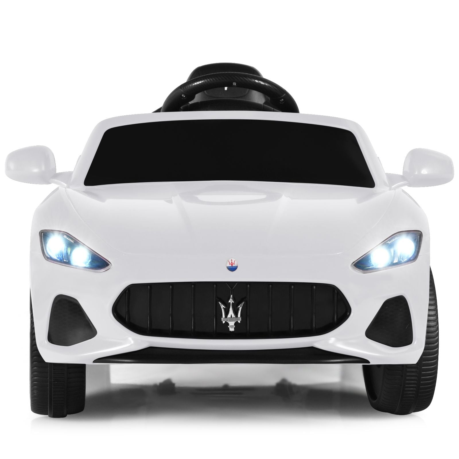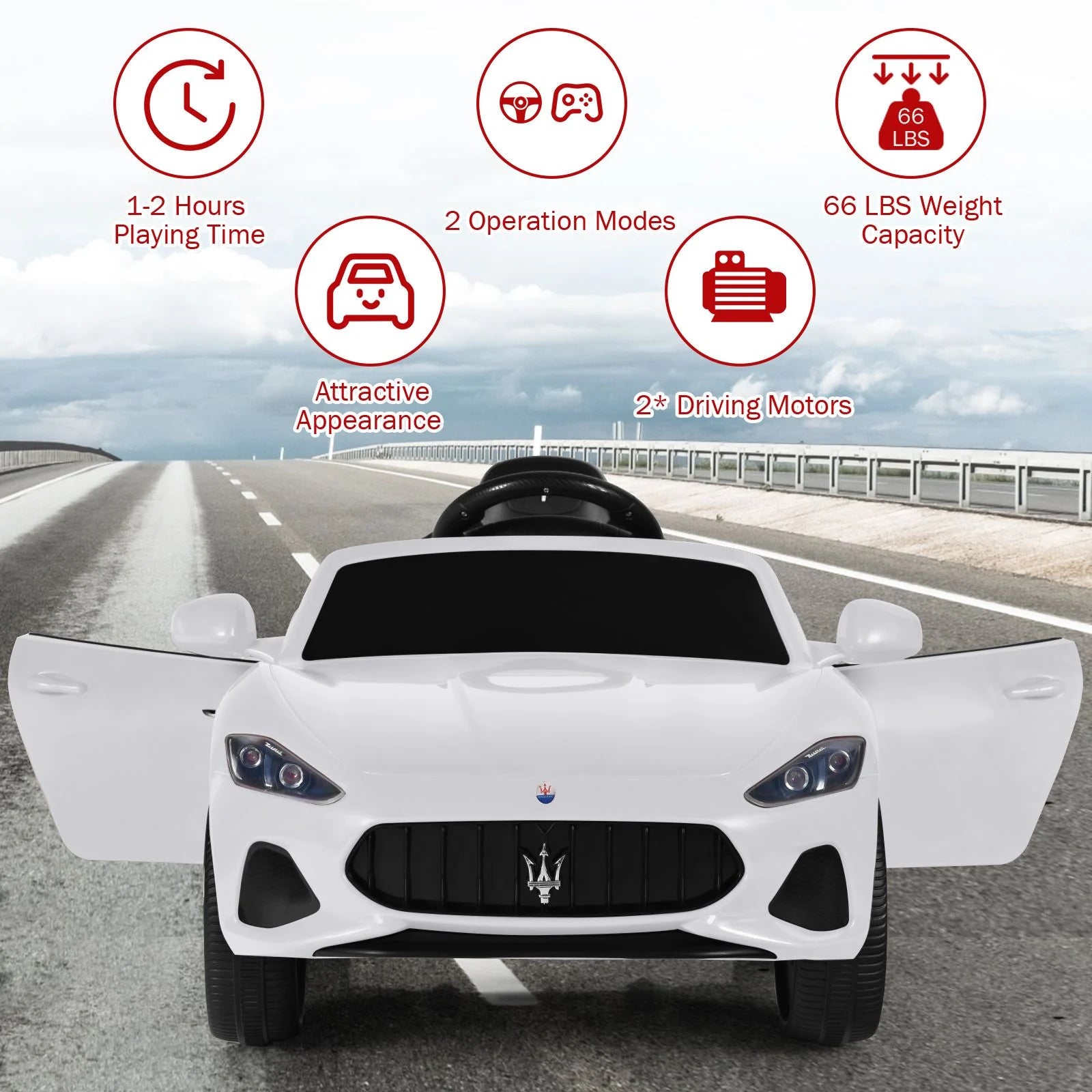 Powerful Kids Ride-On Car: Our Maserati licensed car with 2 powerful driving motors can reach a safe speed of 0.9-1.3 km/h. Rechargeable 12V 4.5AH battery and certified charger adapter allow kids to enjoy 1-2 hours playtime. Besides, with a steering wheel and high/low-speed buttons, kids can freely control its direction and speed.