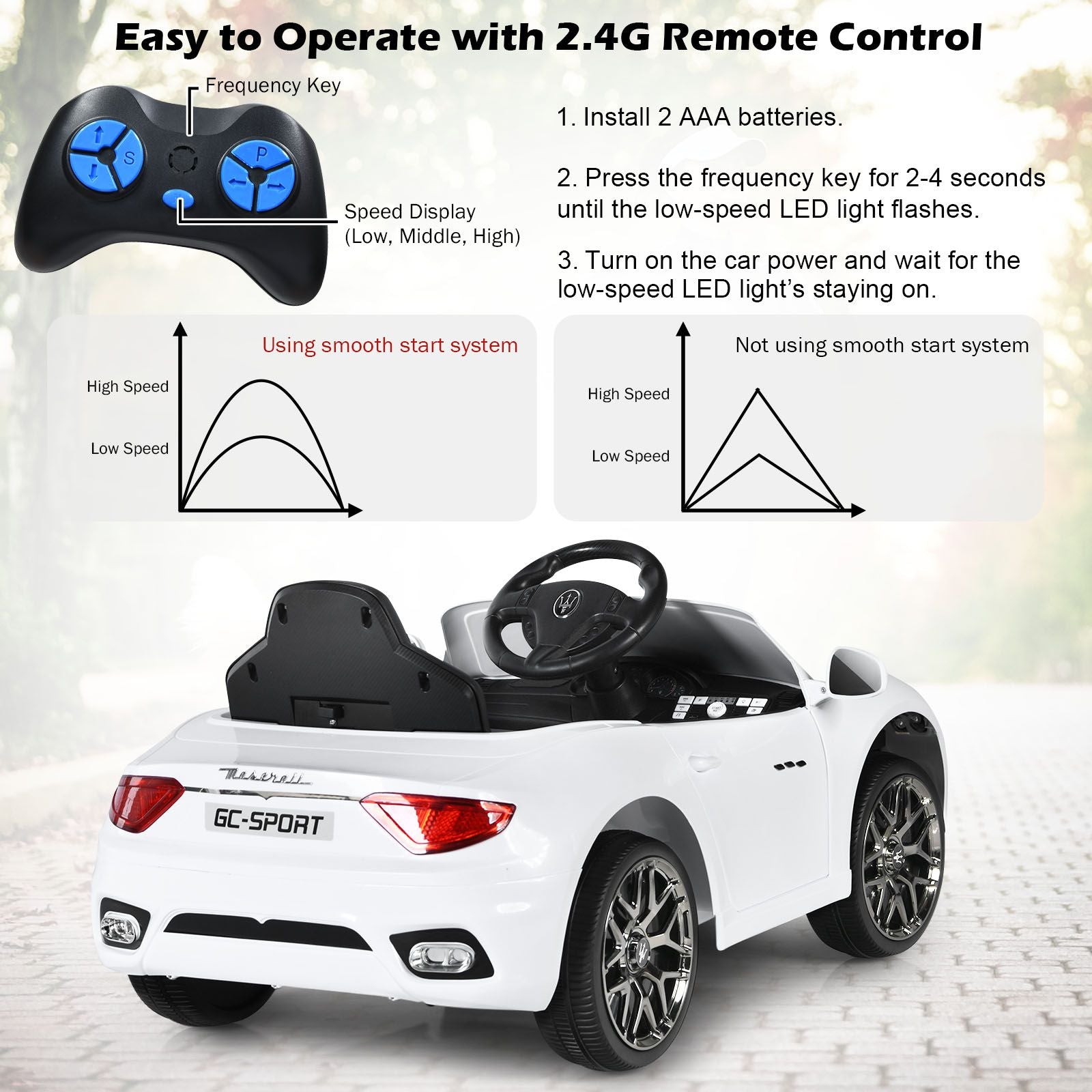 Multiple Safety Protection: Slow start technology avoids sudden start. Thanks to the door-lock, safety belt and 4 wheels with the spring suspension system, our ride-on car ensure a safe and smooth driving. Additionally, 2.4G remote control enables parents to easily operate the electric vehicle to protect kids.