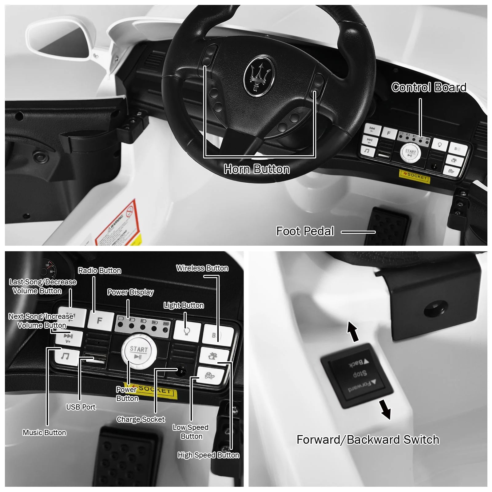 Various Available Functions: Kids can ride forward or backwards by pressing the forward/backward button. Bright headlights, tail lamps and horn sound provide kids with a realistic driving experience. Built-in music, and power display allow for additional fun. Additionally, the USB port helps to connect external devices.