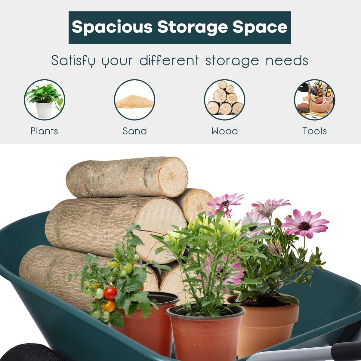 Rigid Steel Frame: Constructed of stable heavy-duty frame and PP container, this garden wheelbarrow offers you a rigid yet lightweight cart to transport your fertilizers and weeding in your garden. And the rubber pneumatic tires on both sides make it easier to lift, balance and maneuver.
