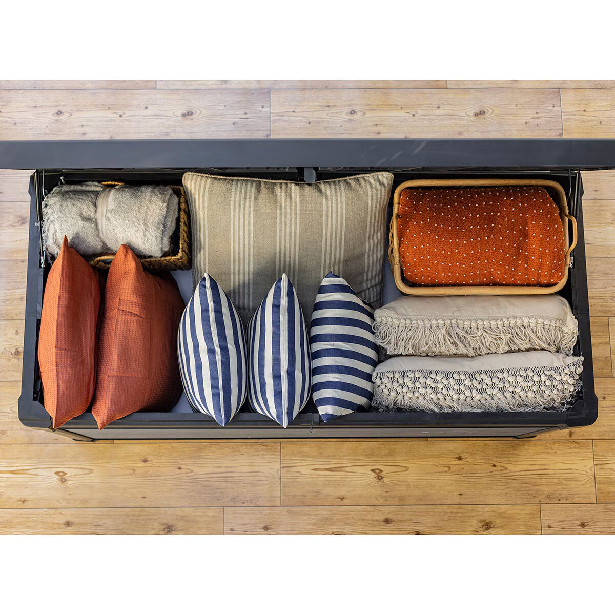 An overhanging top lid and smooth double piston system keeps water out and fingers safe, while providing easy top access to 570 litres of space. Ideal for storing garden cushions and sports gear, as well as large tools which can be safely locked away.