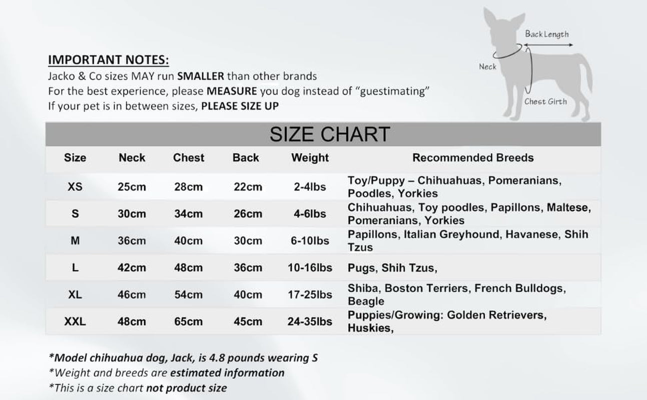• PLEASE MEASURE YOUR PET AND FOLLOW THE SIZE CHART. SIZE UP IF INBETWEEN SIZES (OUR SWEATERS RUN SMALL COMPARED TO OTHER BRANDS).