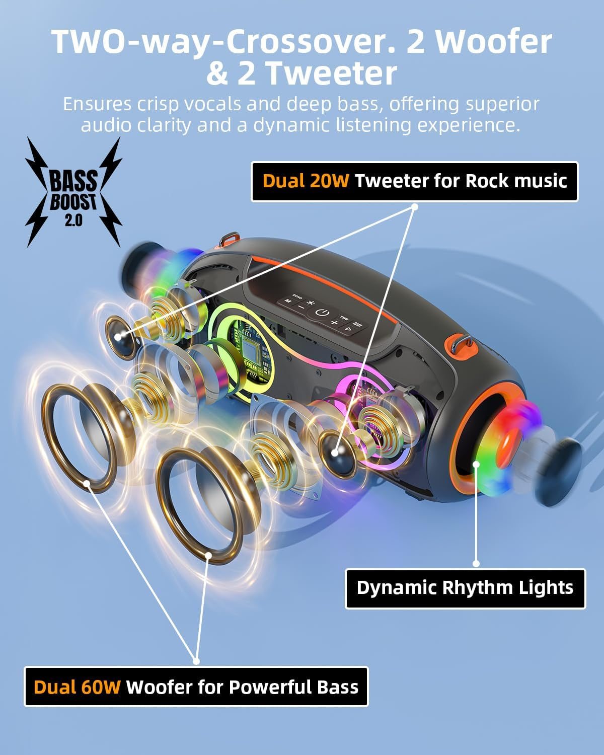 • 🎶 180W MAX DYNAMIC SOUND WITH DEEP BASS & CRYSTAL-CLEAR HIGHS: The VUOPAX portable speaker delivers an astounding 180W peak power, featuring dual 3.5'' high-output woofers that create thunderous, room-shaking bass, complemented by dual tweeters that provide crisp, distortion-free highs. Whether you're hosting a backyard party, enjoying a BBQ, or embarking on a camping adventure, this Bluetooth speaker fills any space with rich, immersive sound that brings your favorite music to life.