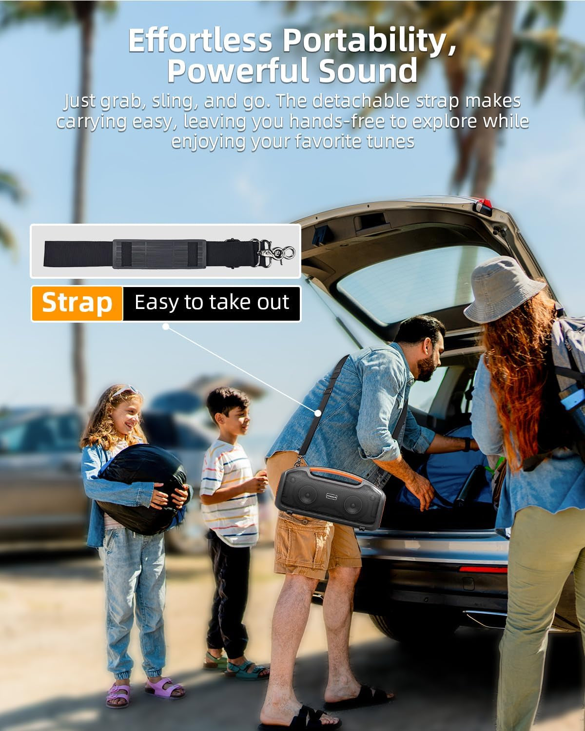 • 🎶 12,000mAh LONG-LASTING BATTERY: Equipped with a massive 12,000mAh battery, this speaker offers an impressive playtime of up to 20+ hours (volume-dependent) and supports fast charging. Ideal for road trips, all-day festivals, or extended camping expeditions, this speaker is perfect for those who love to enjoy music all day long.