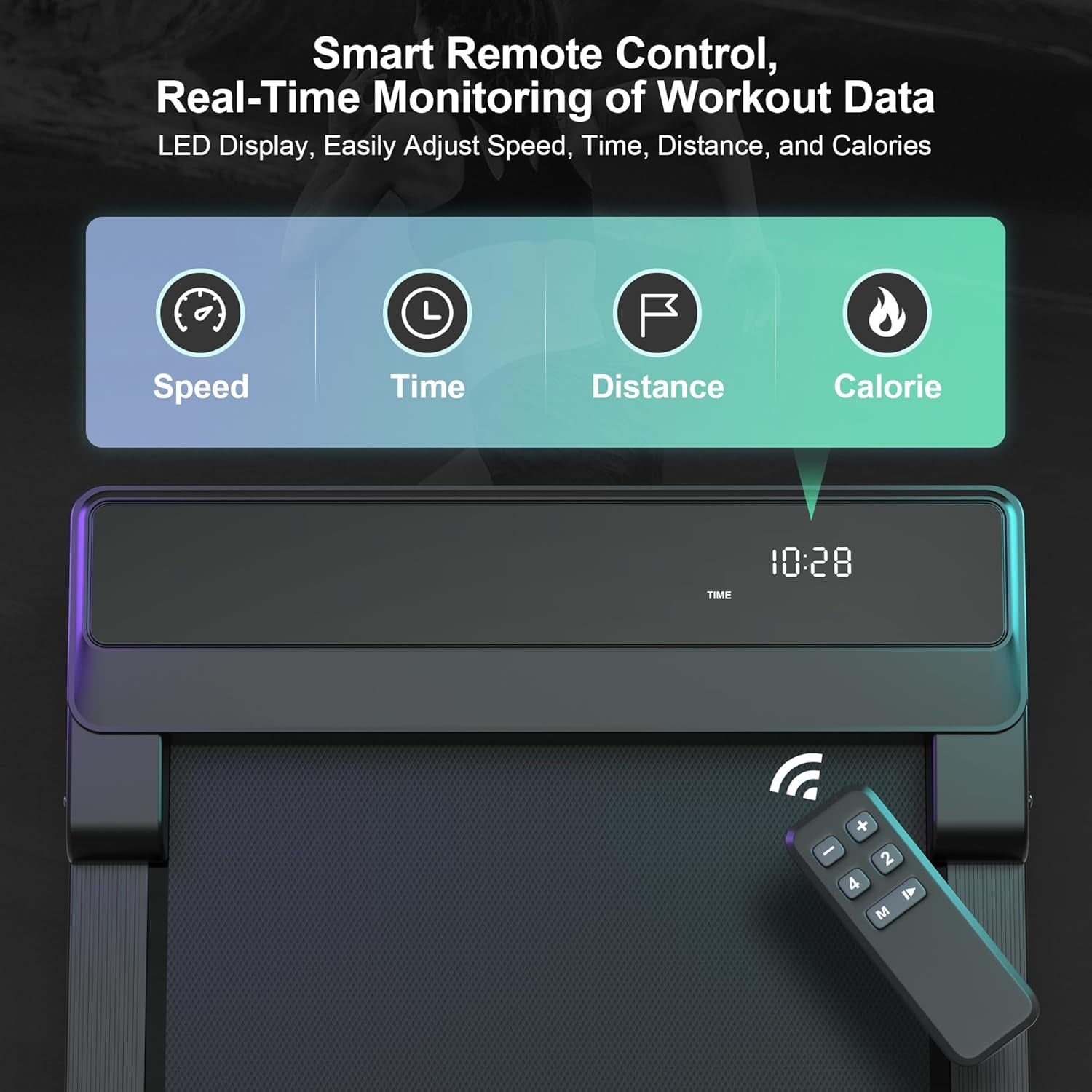 • 【LED Display & Remote Control】Ideal for treadmills for home, it is equipped with an LED screen showing real-time stats (time/distance/calories/speed). Supports remote speed adjustment (1-6 km/h), pause, and stop functions, ‌allowing you to effortlessly manage your workout rhythm without bending down, enhancing operational convenience and safety‌.